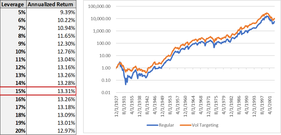 When you put these two facts together there is an obvious implication— when realized volatility is high, it is best to reduce your exposure. A simple way to do this is scale down exposure by a linear factor of volatility above some hurdle. A backtest of SP500 returns levered at the lesser of 2.1x or [(15%) / (historical vol)] * (2.1) shows this strategy outperforms a basic 2.1x leverage— largely due to the outperformance during the great depression: