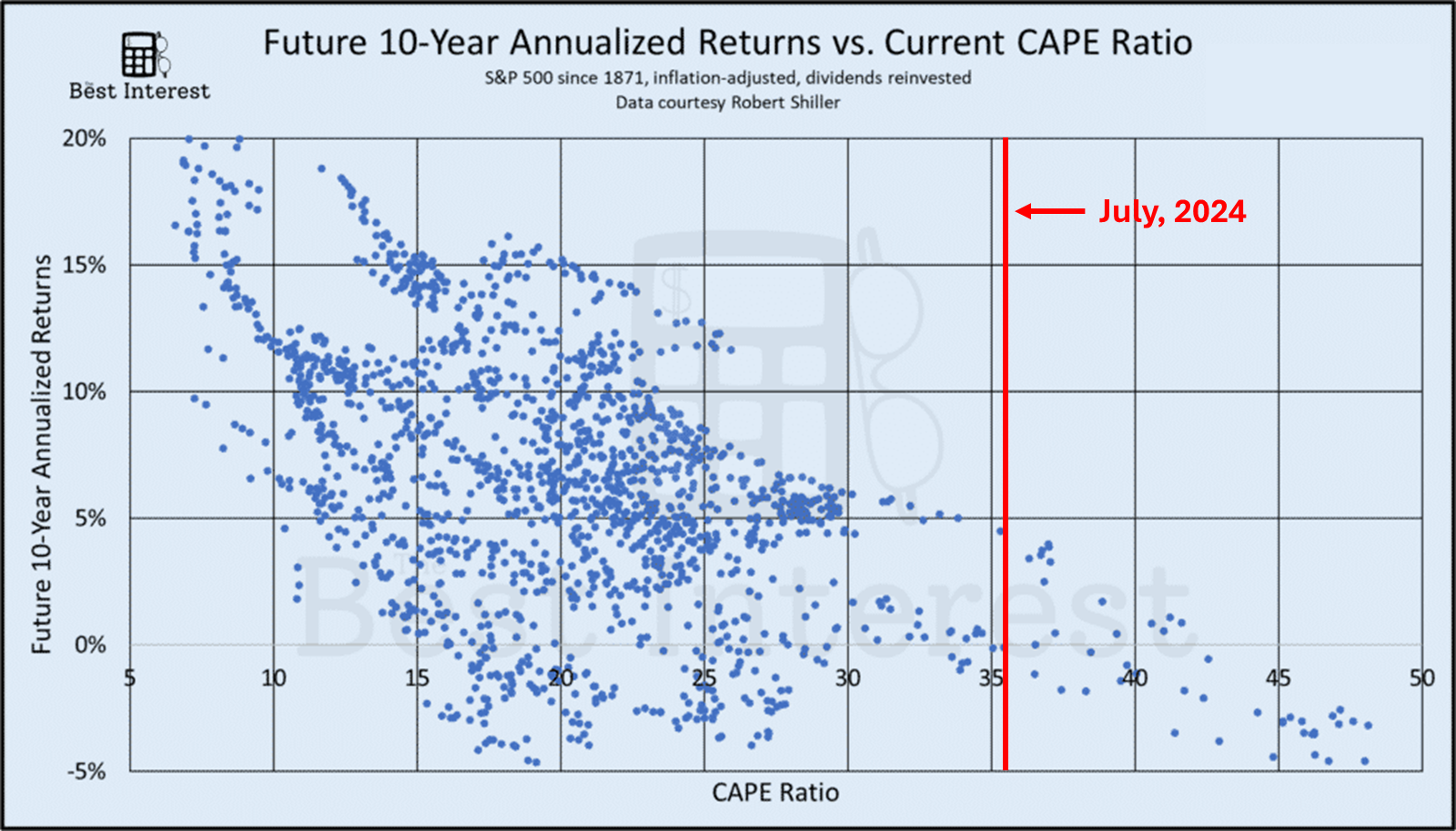 Today, market valuations aren’t as high as they were during the dotcom bubble, but based on historical regression vs. the CAPE ratio, they are certainly pointing to flat to single digit go-forward real returns. Should that mean the go-forward optimal solution is the same is the past? I’m not sure, but leveraging your portfolio is an explicit bet that you think the equity return will be higher than rates, and with margin rates at 6%, that’s a fairly high hurdle.