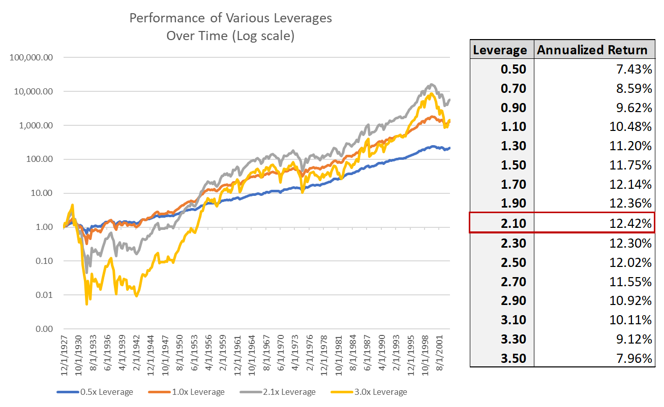 If you take lever the SP500, rebalancing to the given exposure each day, with a borrowing cost at that days short term risk free rate, the optimal amount of leverage is 2.1x. That is the leverage that produces the highest historical return, with the added volatility on any additional leverage dragging returns lower again.