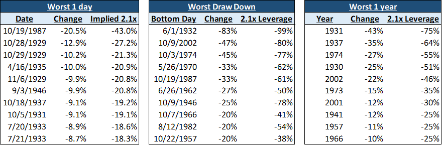 The worst one day draw down in SP500 history was the famous Black Monday. This shows the obvious limits of leverage— at 5.0x leverage a single day draw down would have wiped out a portfolio. But even 2.0x or 3.0x leverage creates enormous one day drawdowns. And who is to say that there isn’t a greater drawdown at some point in the future? If we’ve seen markets drop 20% in a day, why can’t they drop 30% or more?