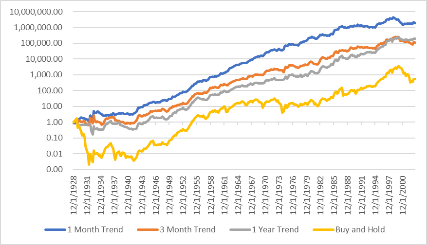 The second lesson from quantitative finance is that across almost all tested time frames, and across numerous assets, things “going up” continue “going up”. Beta is no exception here. A simple back test shows that a trend following strategy2 vastly outperforms a buy and hold strategy.