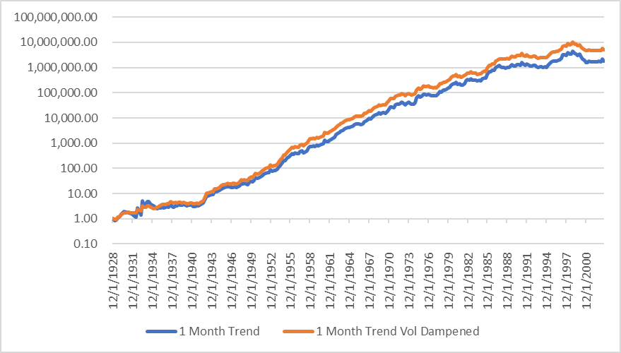 But let’s take this a step further. There are numerous ideas from systematic finance that can be applied here, but two stand out as easily applicable, well tested, and non-proprietary— vol targeting and trend following.